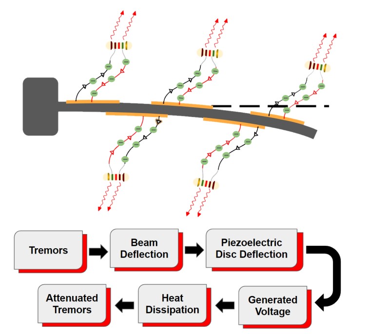 After many iterations, we settled on a design that we felt like could work. The idea is that the mechanical energy of vibrations get converted into electrical energy by the piezoelectric discs. This gets dissipated as heat which results in reduced tremors.