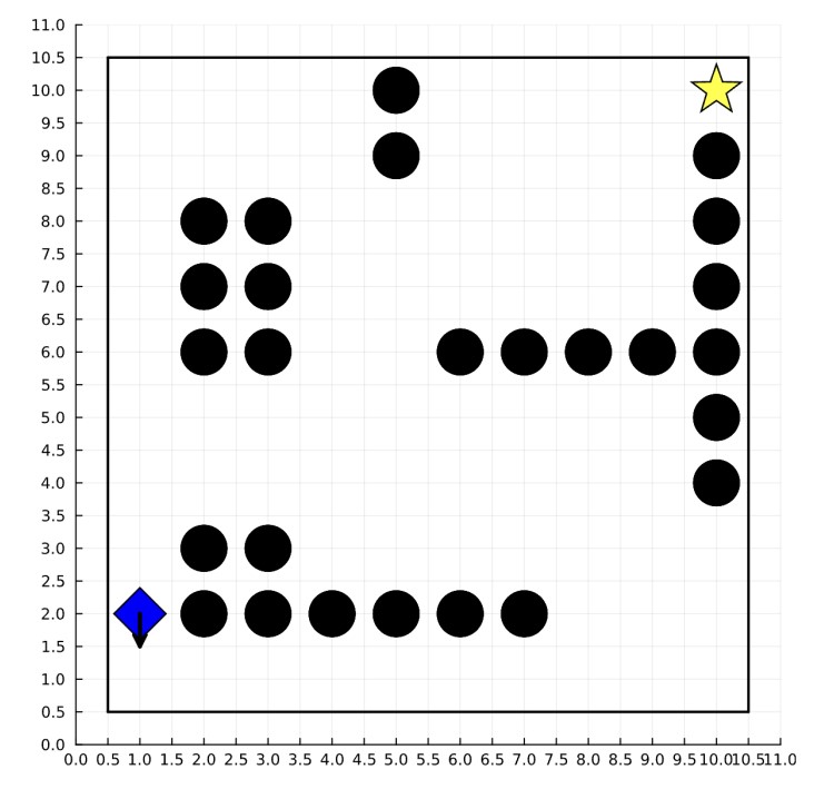 The complex environment also features randomly generated obstacles. But, the location of the goal region is fixed between generations.